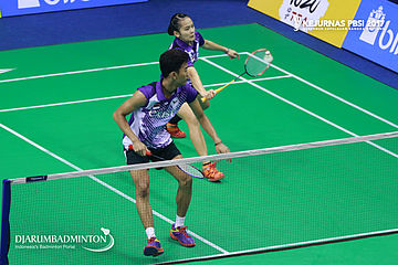 Pramudya Kusumawardana/Indah Cahya Sari Jamil (Jawa Tengah) Mengembalikan Shuttlecock