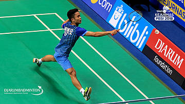 Anthony Sinisuka Ginting (SGS PLN Bandung) Berusaha menggapai shuttlecock