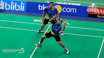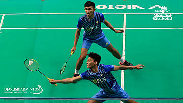 Fajar Alfian+Muhammad Shohibul Fikri (SGS PLN Bandung) Menahan serangan lawan