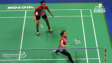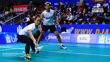 Alfian Eko Prasetya+Della Destiara Haris (Jaya Raya Jakarta) Mengembalikan shuttlecock