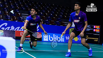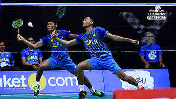 Fajar Alfian+Muhammad Shohibul Fikri (SGS PLN Bandung) Berusaha menggapai shuttlecock