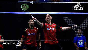 Berry Angriawan+Kevin Sanjaya Sukamuljo (Djarum Kudus) Menyambar pengembalian lawan