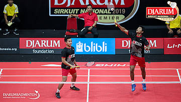 Muhammad Adani Husein+Muhammad Yahdil Ansar (Jaya Raya Jakarta) menggapai shuttlecock