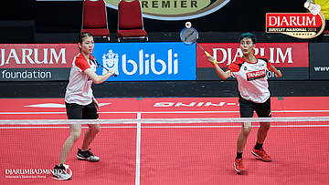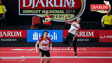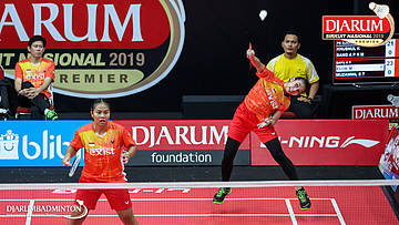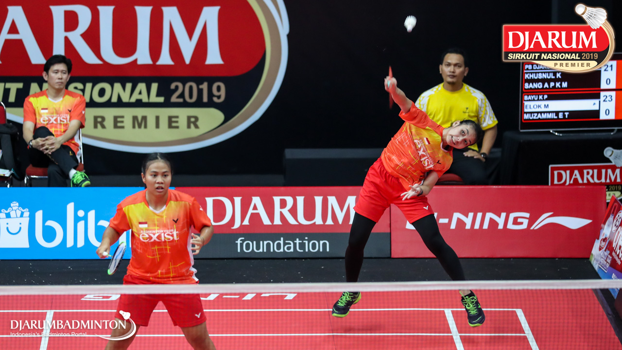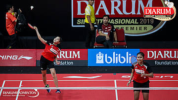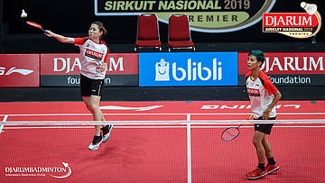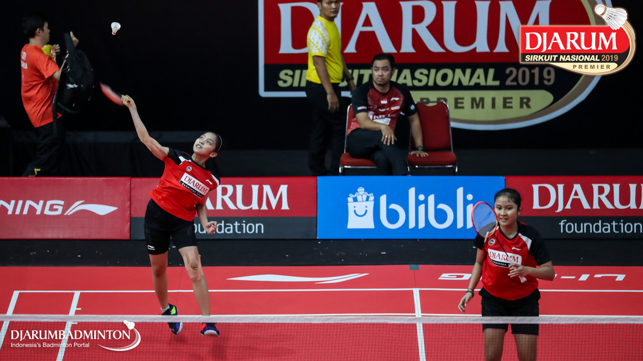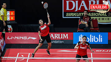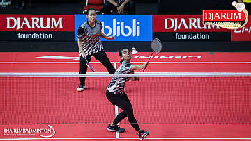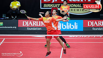 Khusnul Khatimah+Sang Ayu Putu Kharisma Maharani (PB Djarum, Kudus+PB Djarum, Kudus) menggapai shuttlecock