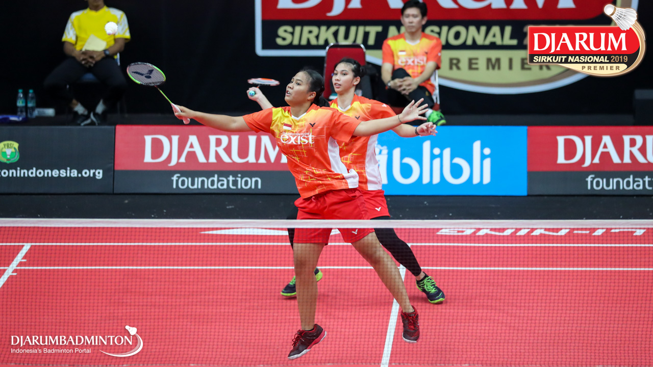 Jesita Putri Miantoro+Putri Larasati (Exist Badminton Club) melepaskan serangan