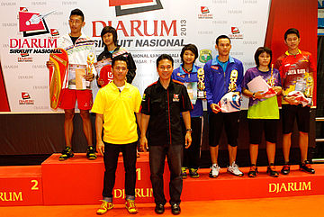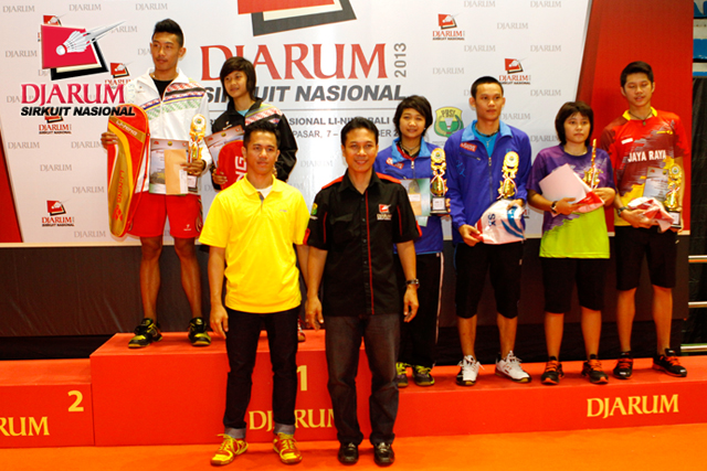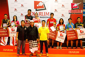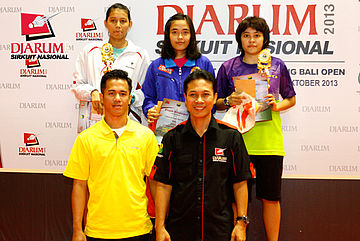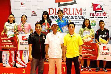 Mychelle Crhystine/Rofahadah Supriadi (PB Djarum) bersiap megembalikan shuttlecock ke arah Dianita Saraswati/Yulfira Barkah (Mutiara Bandung).