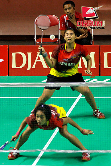 Clara Titi/Desaula Gendy (Jaya Raya) bersiap menghadang serangan yang dilepaskan Linda Mutiara/Sinta Arum (Mutiara Bandung).