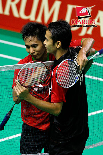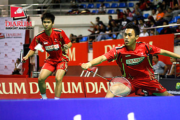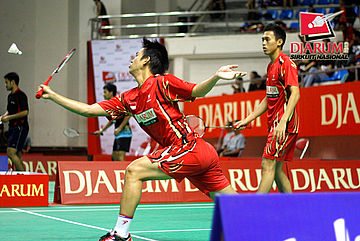 Abu Bakar/Tedi Supriadi (PB Djarum) menyambut serve dari Akbar Bintang/Kevin Ersa (PB Djarum).