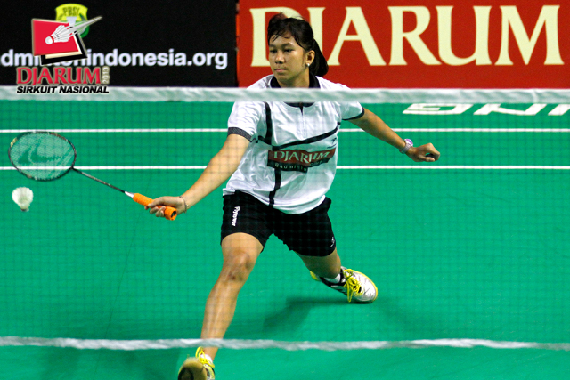 Made Deya Surya (Pelatprov Bali) mengembalikan shuttlecock ke arah Melisa Andesti (PB Djarum).