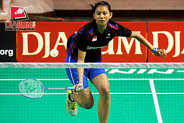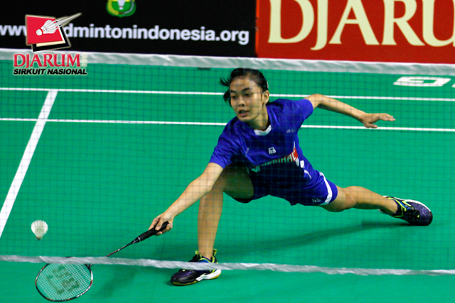 Linda Mutiara (Mutiara Bandung) berusaha menggapai pengembalian shuttlecock dari Devi Yunita Indah (PB Djarum).