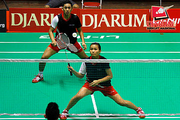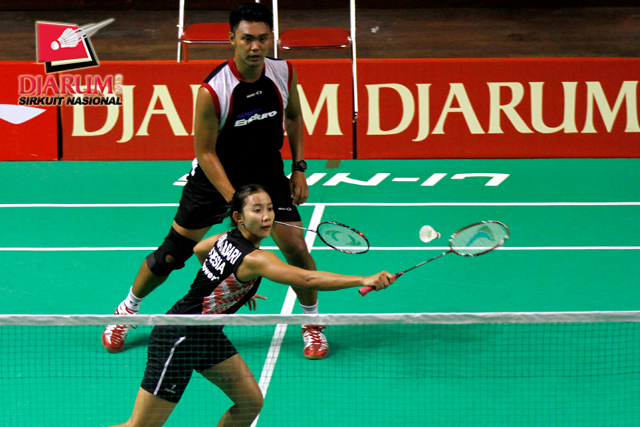 Ardiansyah Putra/Devi Tika Permatasari (Pertamina Indonesia/SGS PLN) bersiap menyambar pengembalian tanggung dari Rizky Hidayat/Ery Octaviani (Hi Qua Wima/Jaya Raya).