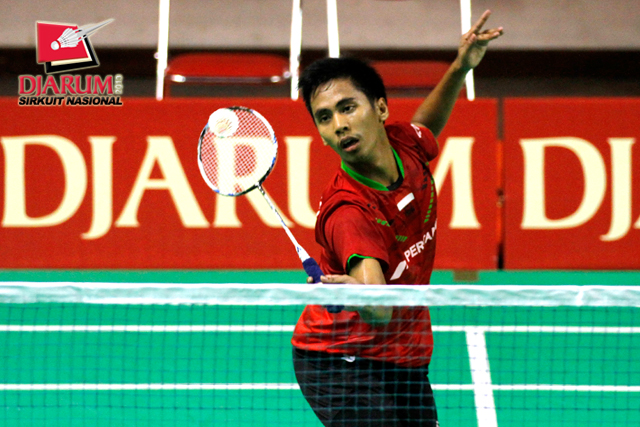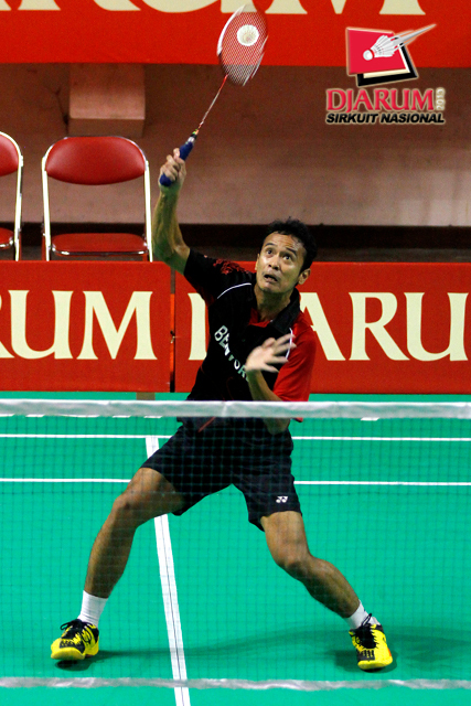 Alamsyah Yunus (Pertamina Indonesia) mengembalikan shuttlecock ke arah Senatria Agus (SGS PLN).