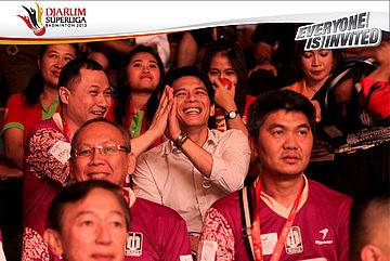 Ariel NOAH (tengah) terlihat gembira saat menyaksikan PB Musika Champion yang diwakili Lee Chong Wei berhasil memetik kemenangan atas Wang Zhengming (SGS PLN)