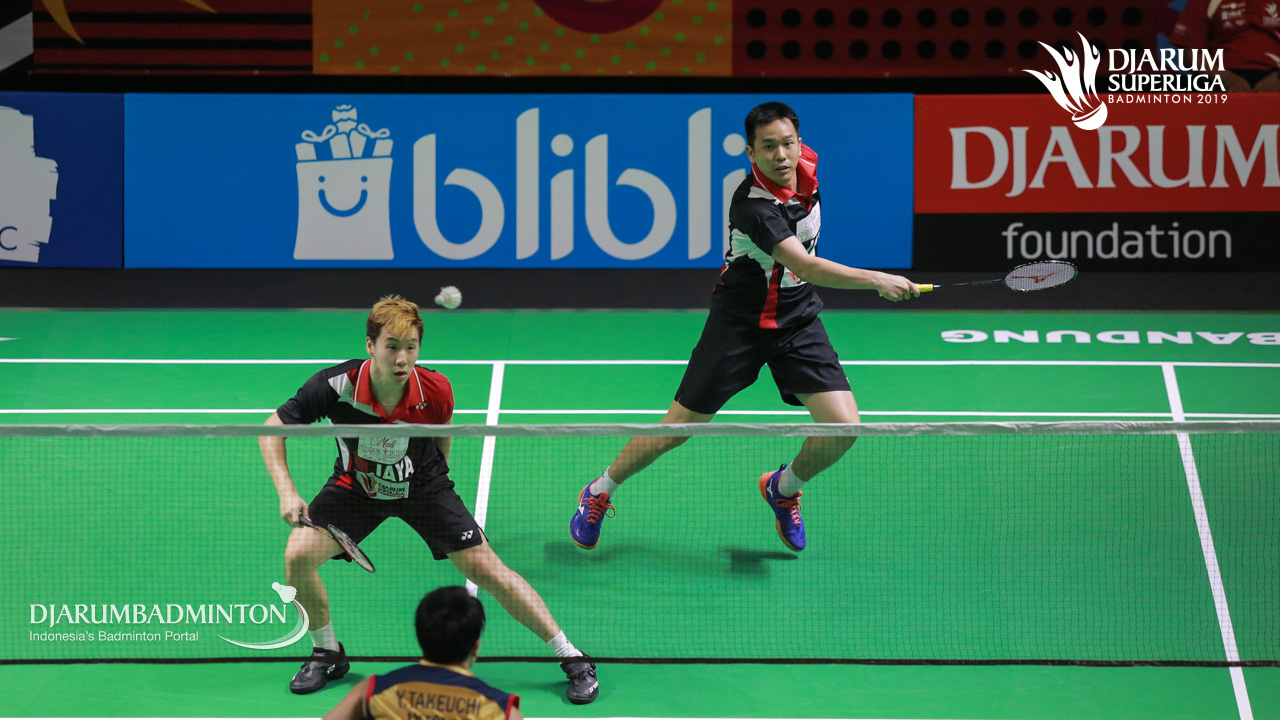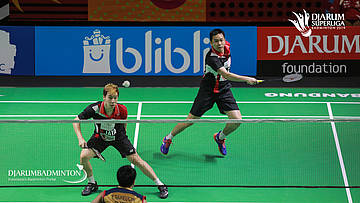 Hendra SETIAWAN+Marcus Fernaldi GIDEON (JAYA RAYA JAKARTA) mengembalikan shuttlecock