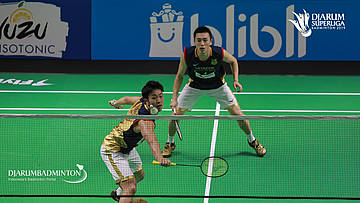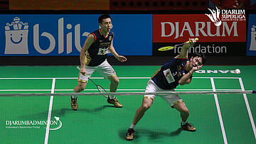 Hendra SETIAWAN+Marcus Fernaldi GIDEON (JAYA RAYA JAKARTA) bersiap melepaskan serangan