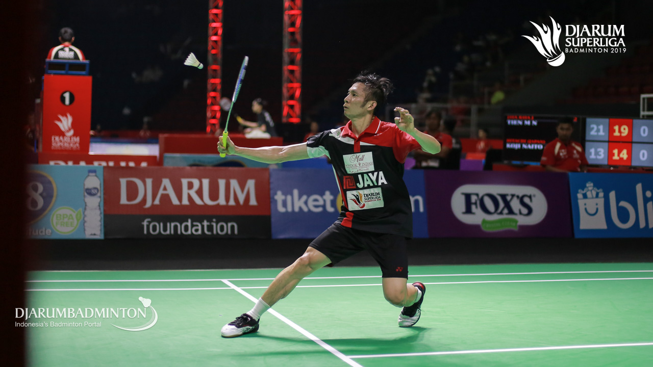 Tien Minh NGUYEN (JAYA RAYA JAKARTA) bersiap menggapai shuttlecock
